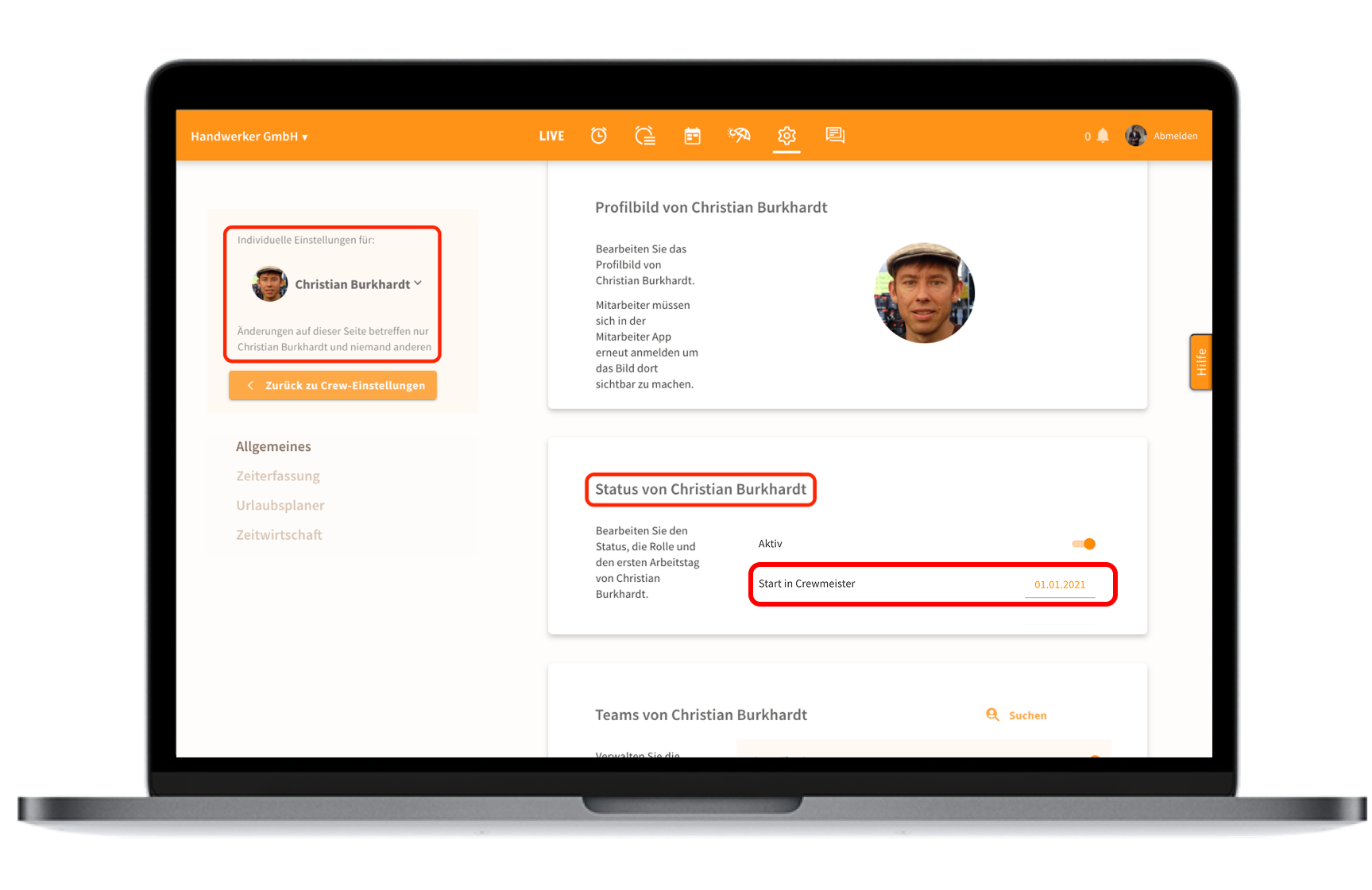 Für jeden Mitarbeiter in Crewmeister ist stets ein Datum "Start in Crewmeister" hinterlegt. Dieses Datum können Sie in den Einstellungen des Mitarbeiter einsehen: Einstellungen > Allgemeines > Klick auf Mitarbeiter > Status des Mitarbeiters