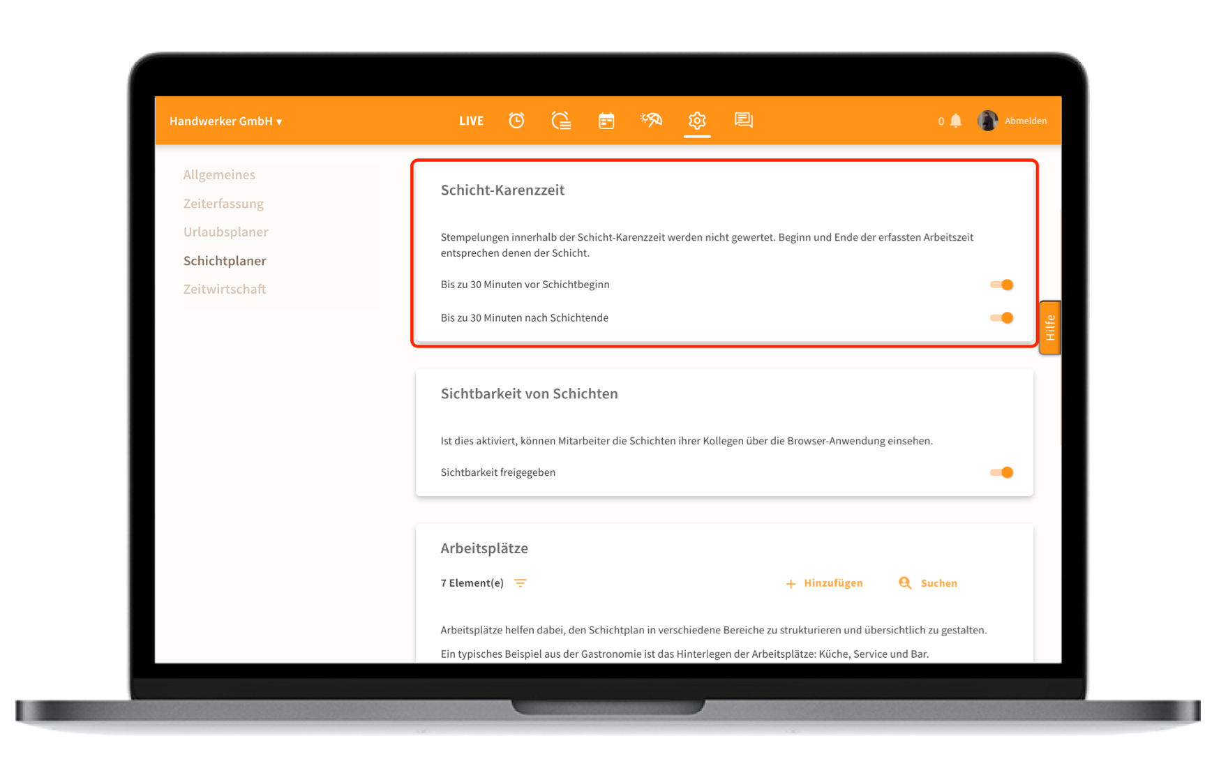 Die Schicht-Karenzzeit können Sie über die Crewmeister Einstellungen (Zahnradsymbol) im Bereich Schichtplaner aktivieren oder deaktivieren. Dabei kann die Funktion für Schichtende oder Schichtstart unabhängig voneinander konfiguriert werden.